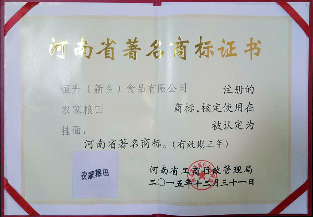 农家粮田省证书
